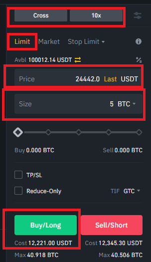 Price(가격)에 포지션 진입가격 24442 입력 Size에 사고 싶은 물량 적으시고 Buy/Long(비트코인이 오른다) 클릭하면 된다.
