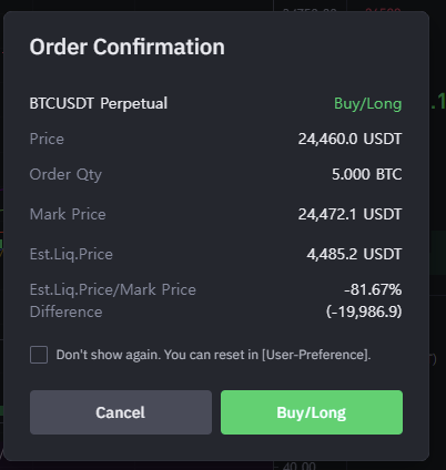 잔고를 10만 USDT를 넣어두고 레버리지 10배로 비트코인 5개를 롱으로 주문할려니까 청산가격(Est.Liq.Price)이 4,485 USDT(600만 원)이라고 뜬다.
