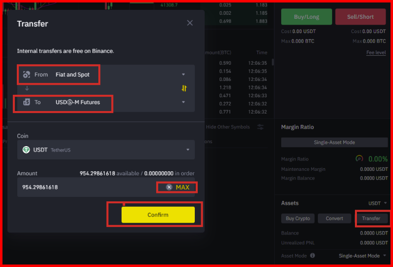클릭 후 위의 사진처럼 현물 지갑(Fiat and Spot) > 선물지갑(USDS-M Futures)으로 USDT를 옮기면 된다.